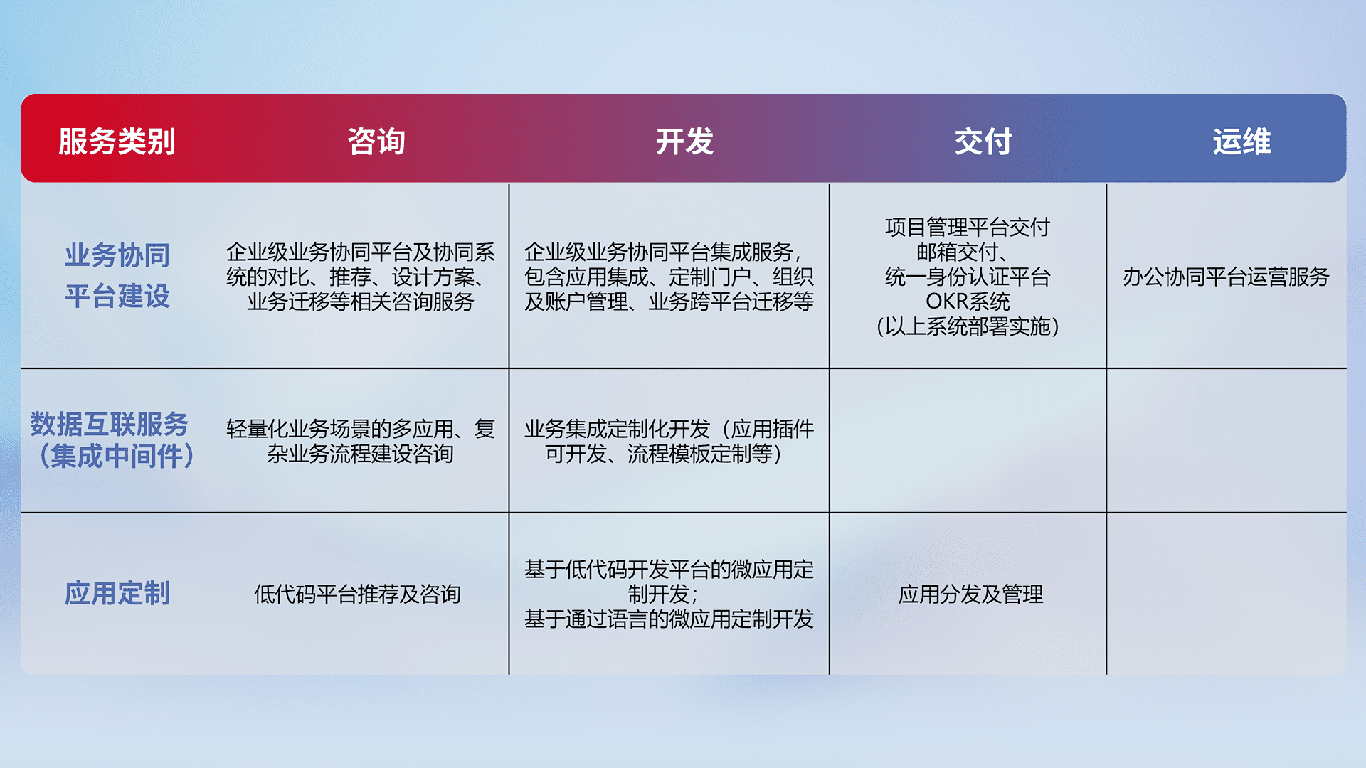 针对钉钉、、、、企微、、、IDaas等平台级产品提供产品的规划、、、、方案、、交付、、定制化开发等服务,,实现如统一协同办公、、、、智能客户服务、、、混合会议管理、、、智能数据查询、、、等业务场景,,,,实现数字化转型。。。